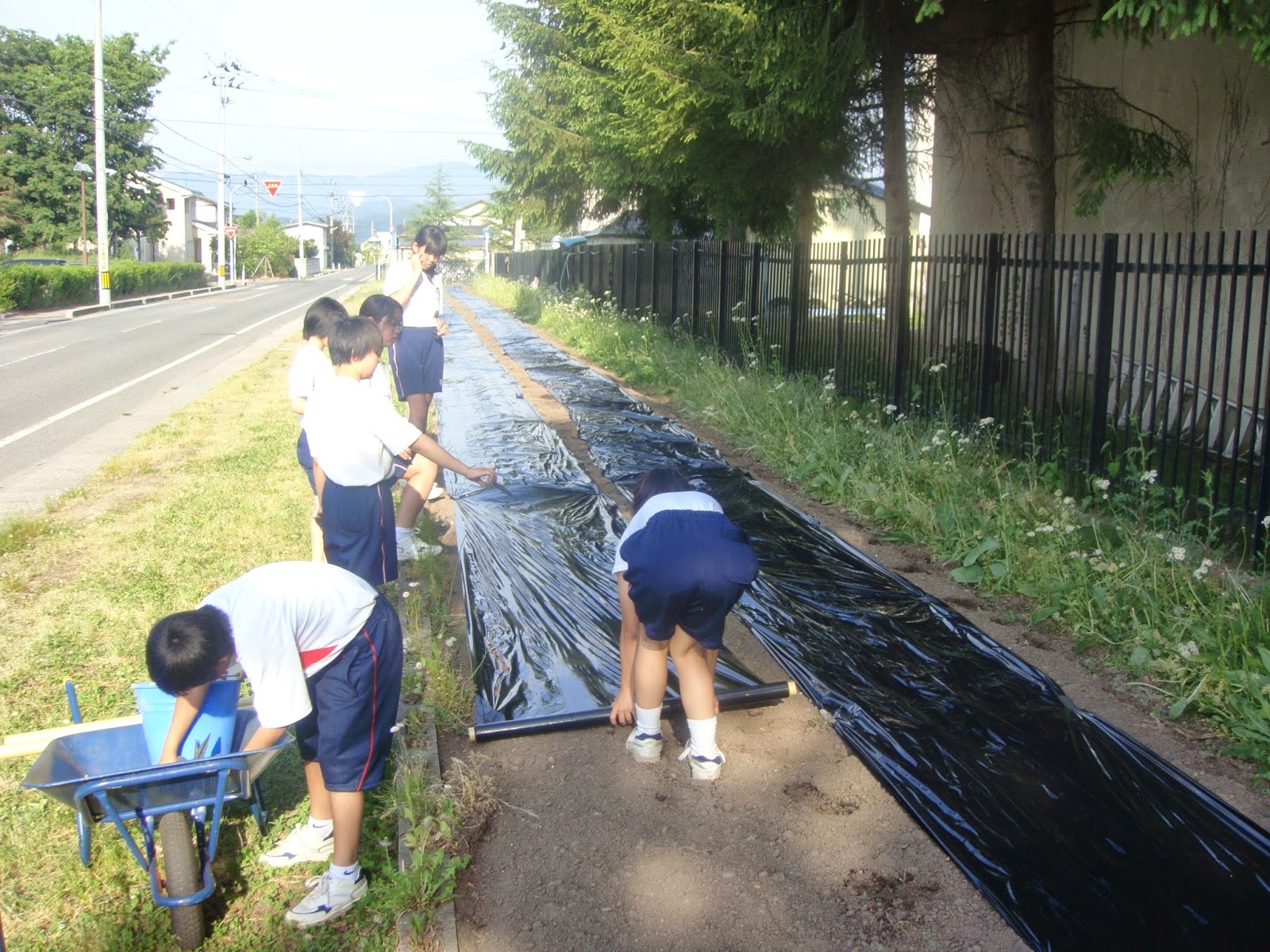 次の日曜日にPTA環境委員会主催の3年親子作業(花植え)が予定されていますが、今日の放課後、総合文化部の皆さんが、その下準備として、花壇を整備したり、マルチを敷いたりという作業をしてくれました。